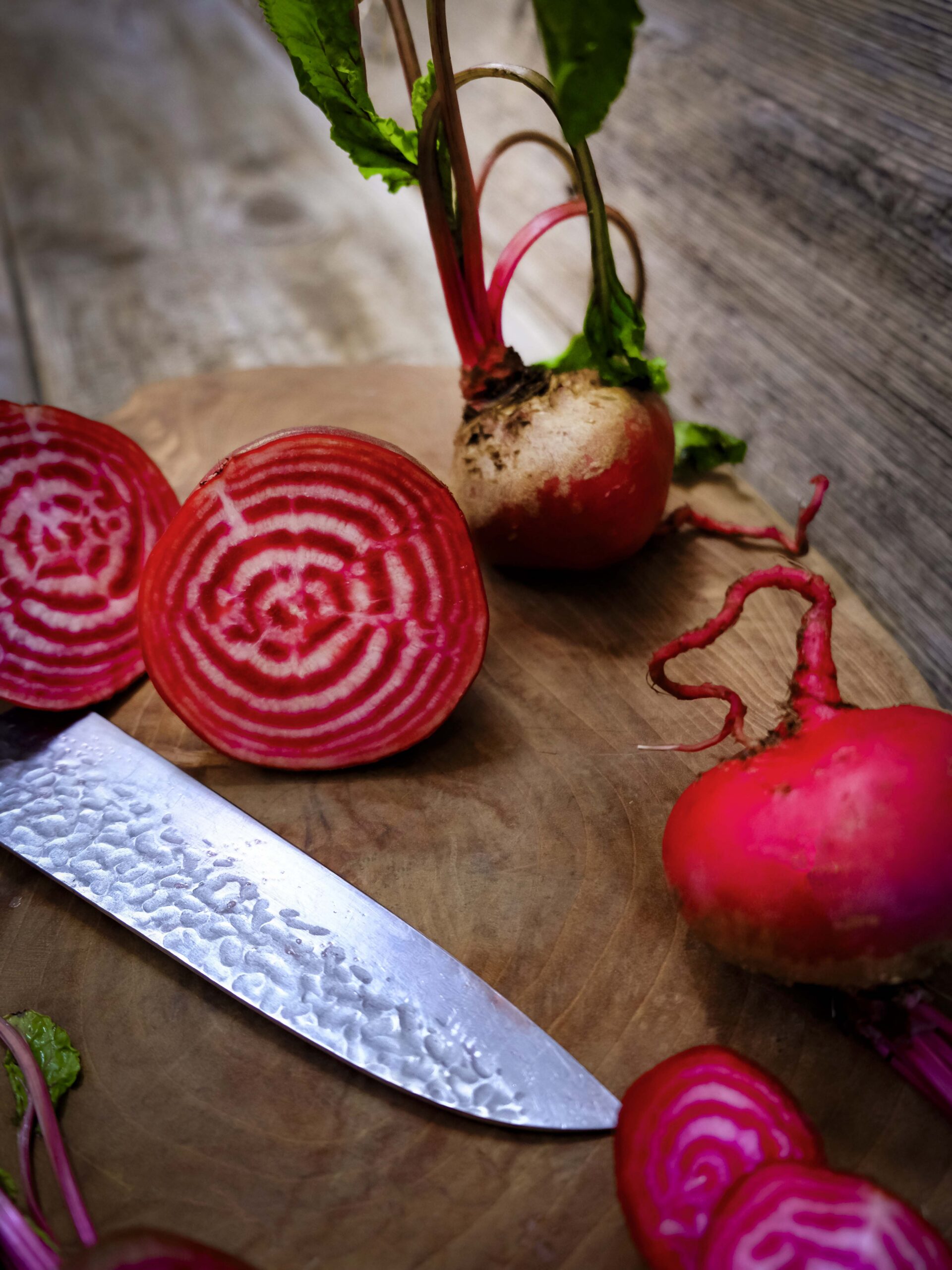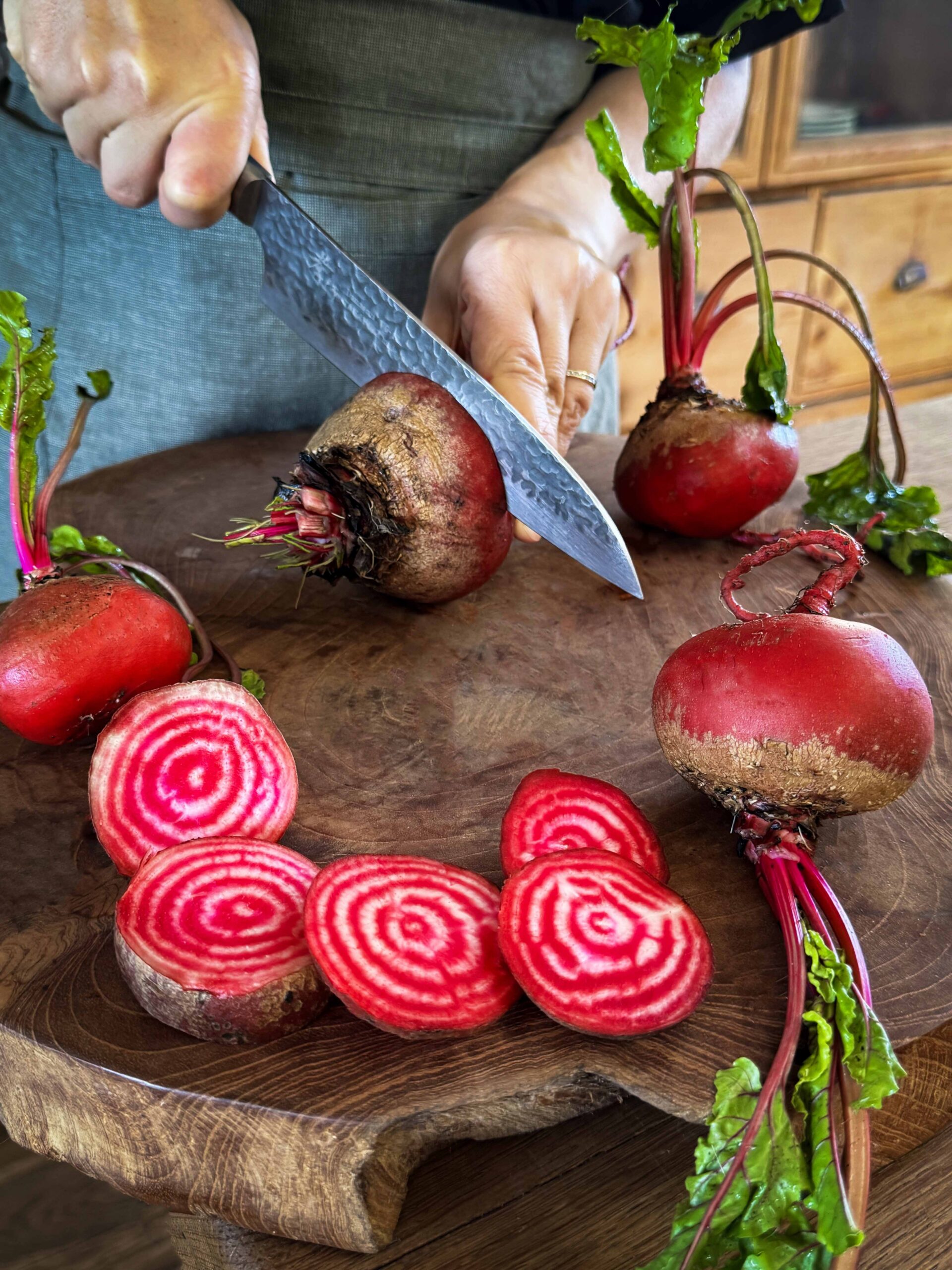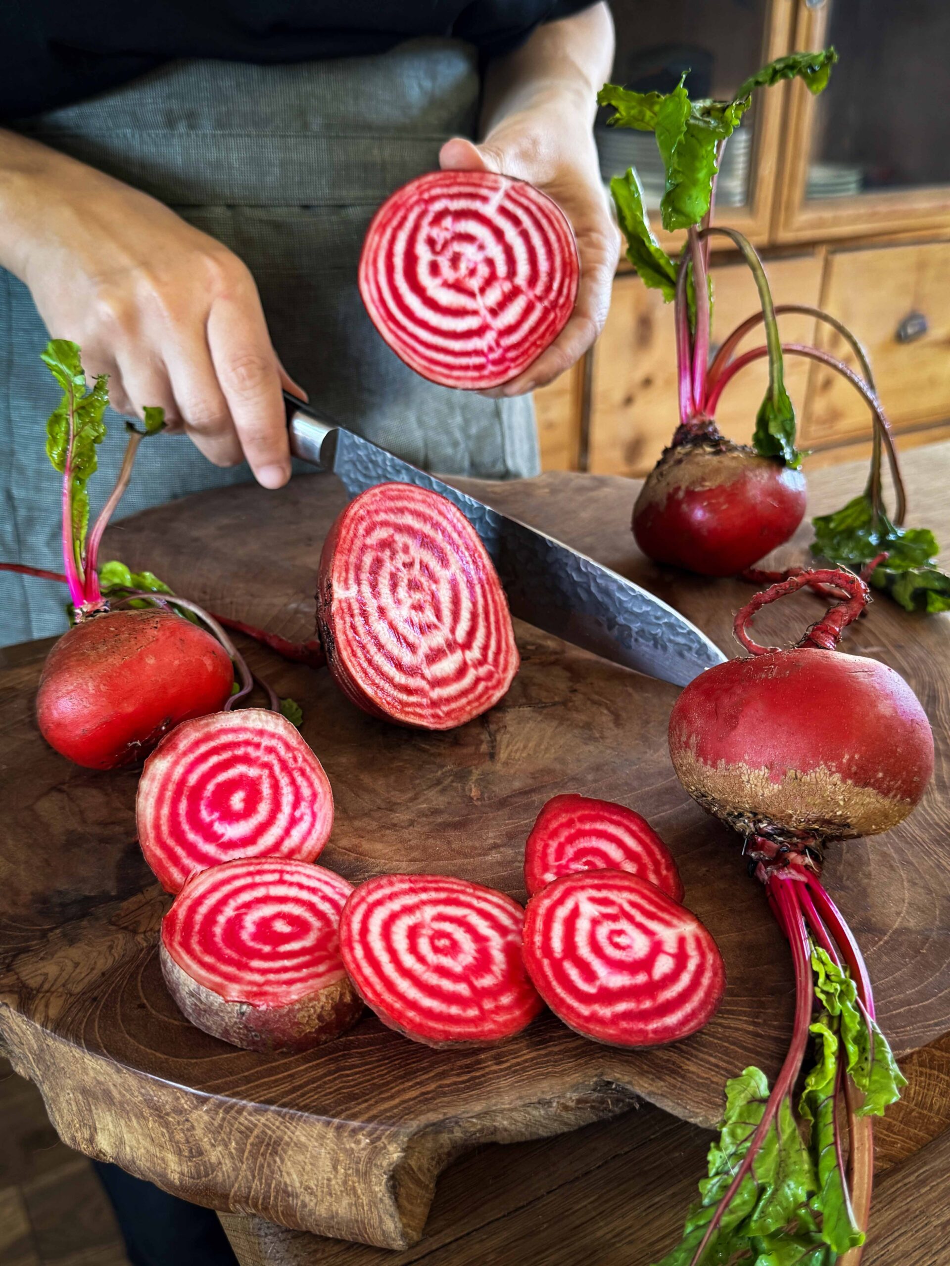 A globe-shaped beetroot that treats you to a beautiful sight when sliced, in the form of red and white candy stripes. The stripes are particularly stunning when sliced thinly into salads and eaten raw. When cooked this heirloom beetroot is sweet and tender and the stripes gently fade a little. Fresh leaf shoots can also be snipped off and eaten in salads.