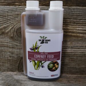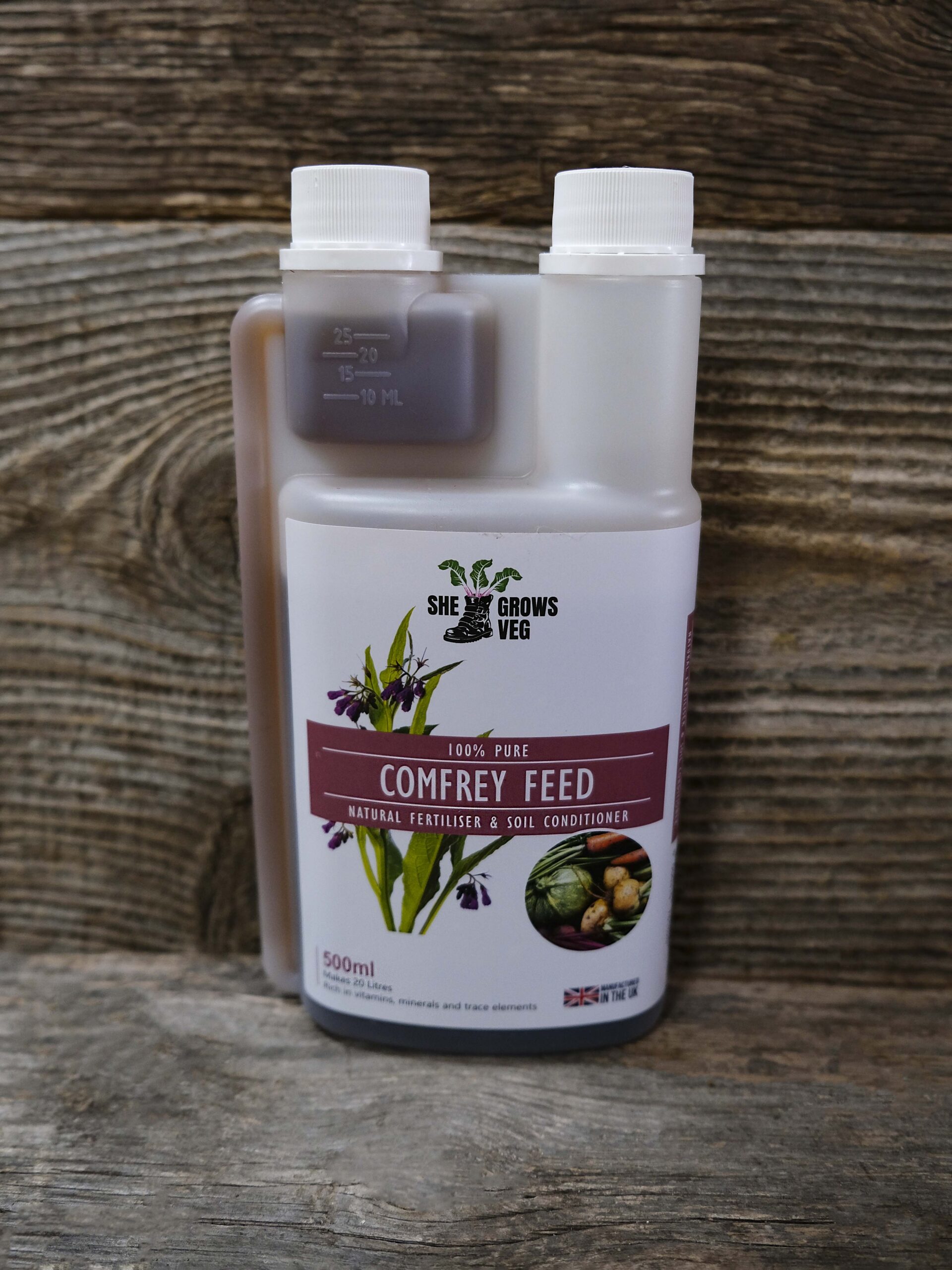 The comfrey feed is made from comfrey plants. It is natural feed and a soil conditioner which is high in the nutrients needed for healthy growth of plants. It will improve blooms on flowers and increase yields on fruit and vegetables.