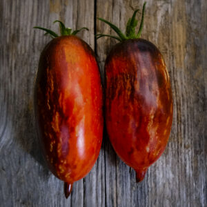 A dwarf variety growing to a very manageable 1.5m in height. It produces strikingly beautiful, plum to round shaped, multi-colored tomatoes with purple-red-gold-striped skin and a distinctive anthocyanin black top.