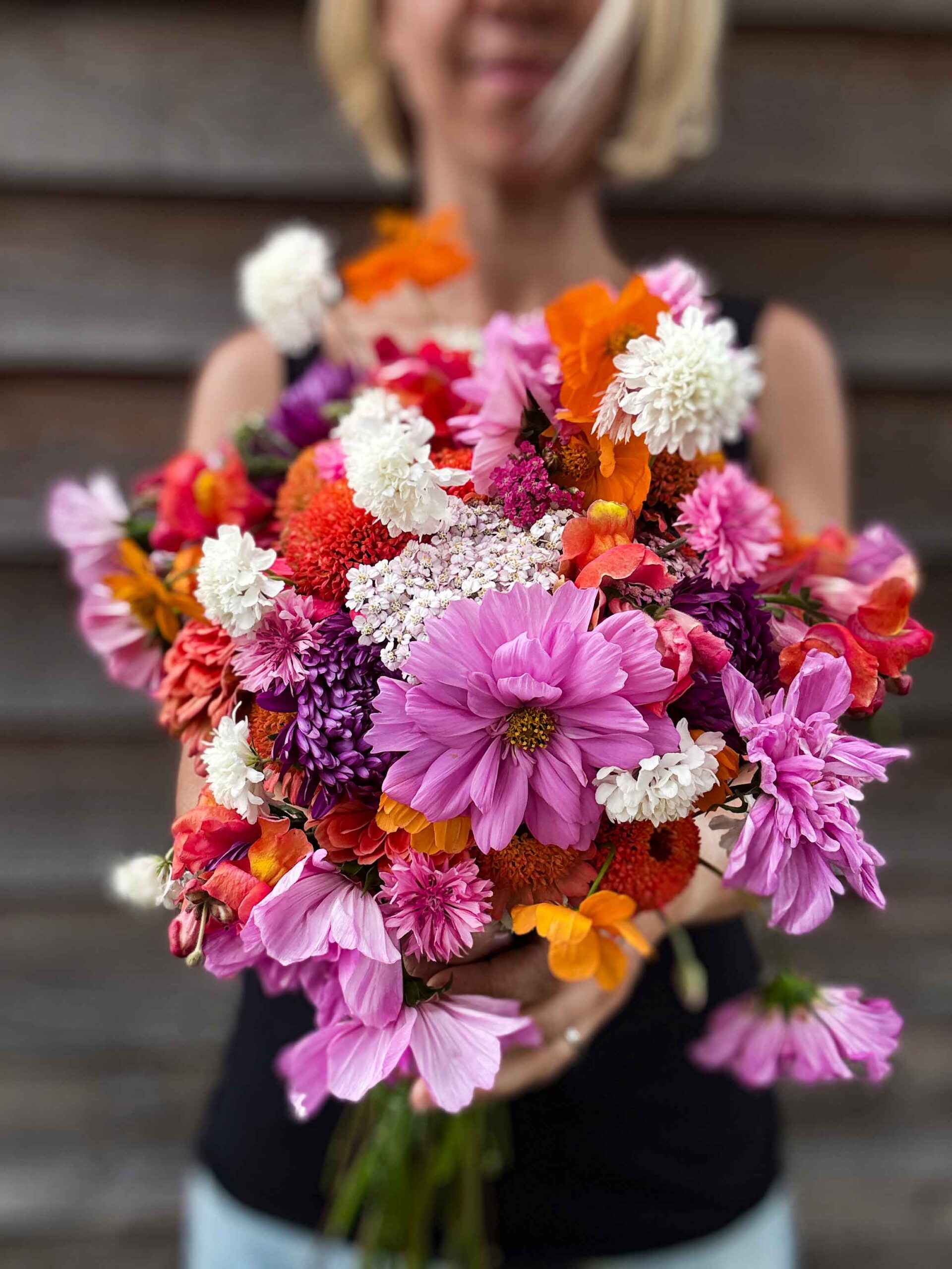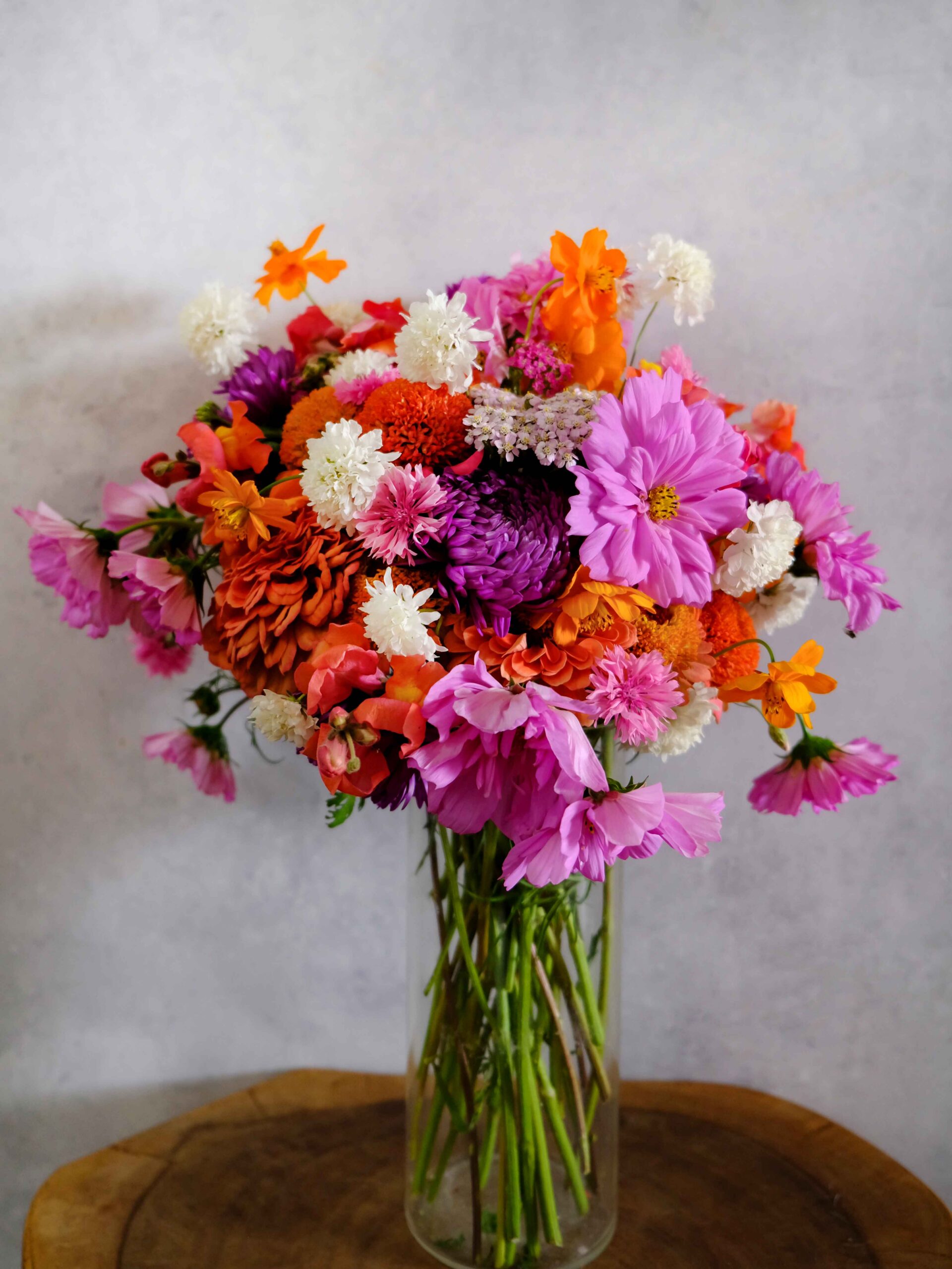 Bold, bright and guaranteed to make you smile. Our Joy Cutting Flower Bundle is a vibrant mix of sunshine oranges, hot pinks and punchy purples, the kind of colours that practically hum with happiness. These are proper mood-lifting blooms, made for big armfuls, kitchen-table bouquets and gifting to someone who needs a little burst of cheer.Â