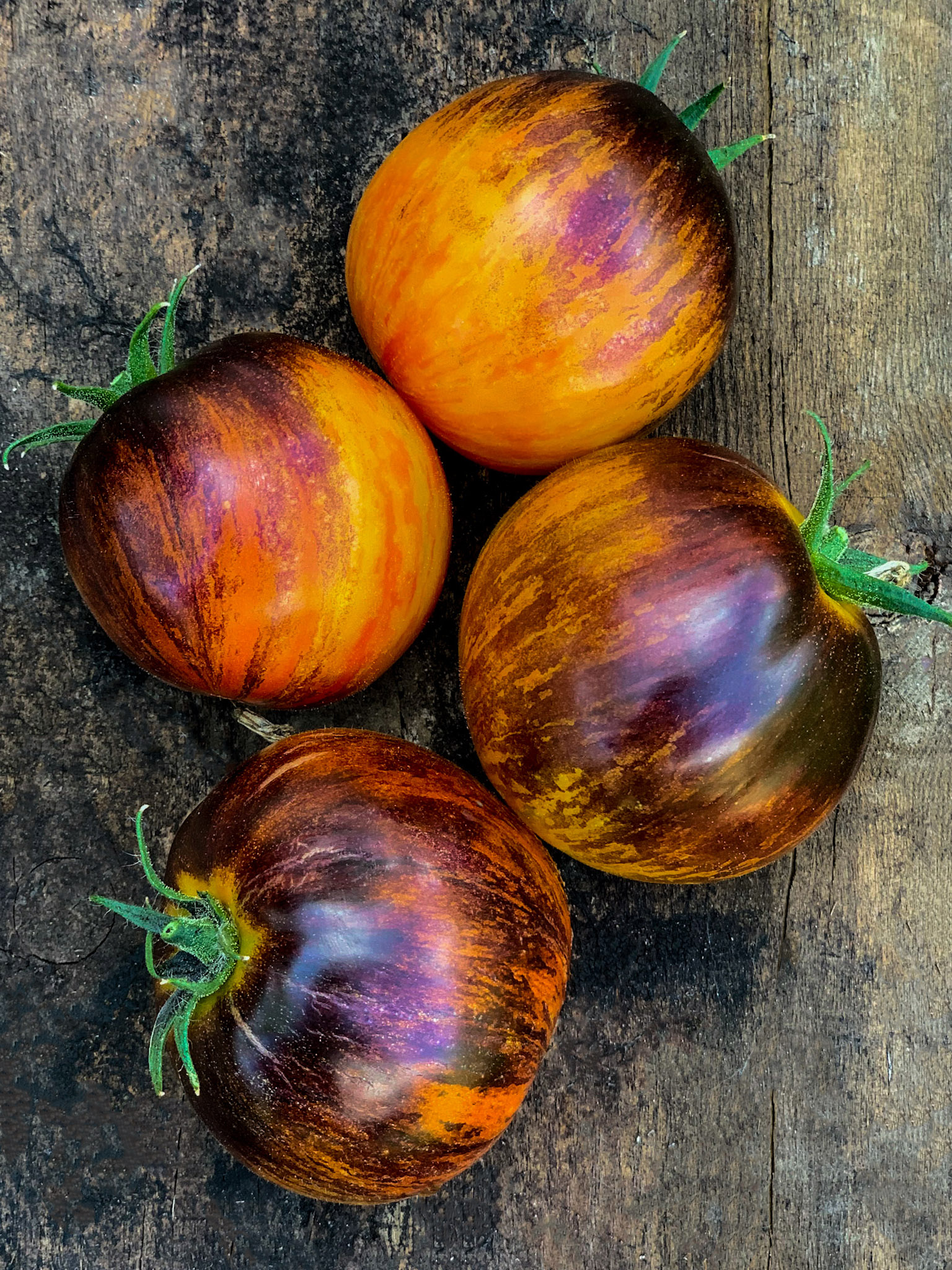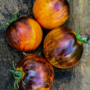 Tomato ‘Alice’s Dream’ is a kaleidoscope of colour, with golden-yellow skin streaked in purple and marbled flesh that’s as dreamy as its name. The flavour is rich, sweet, and slightly citrusy, with a silky texture that melts on the tongue. A magical, mood-lifting heirloom that tastes as good as it looks.