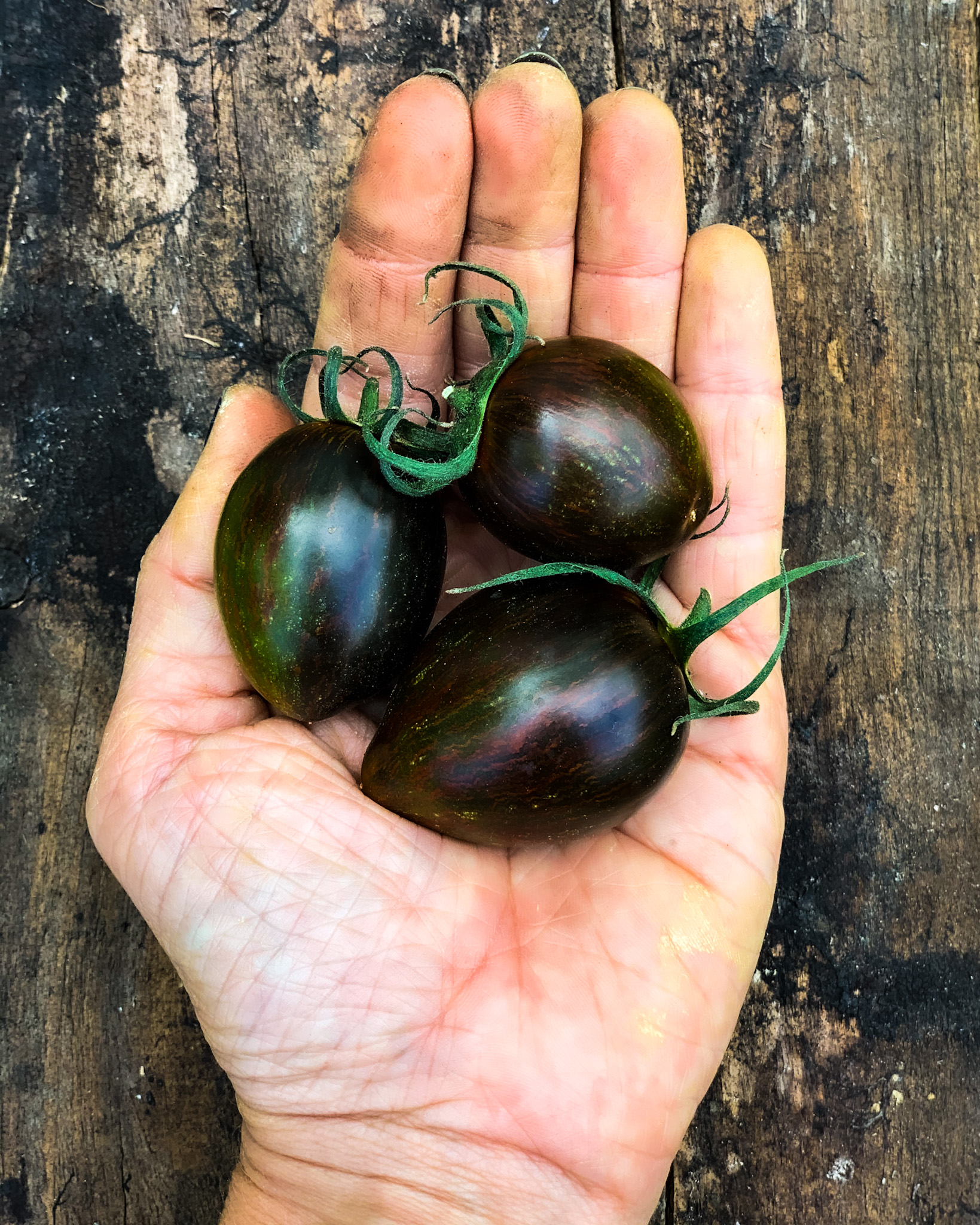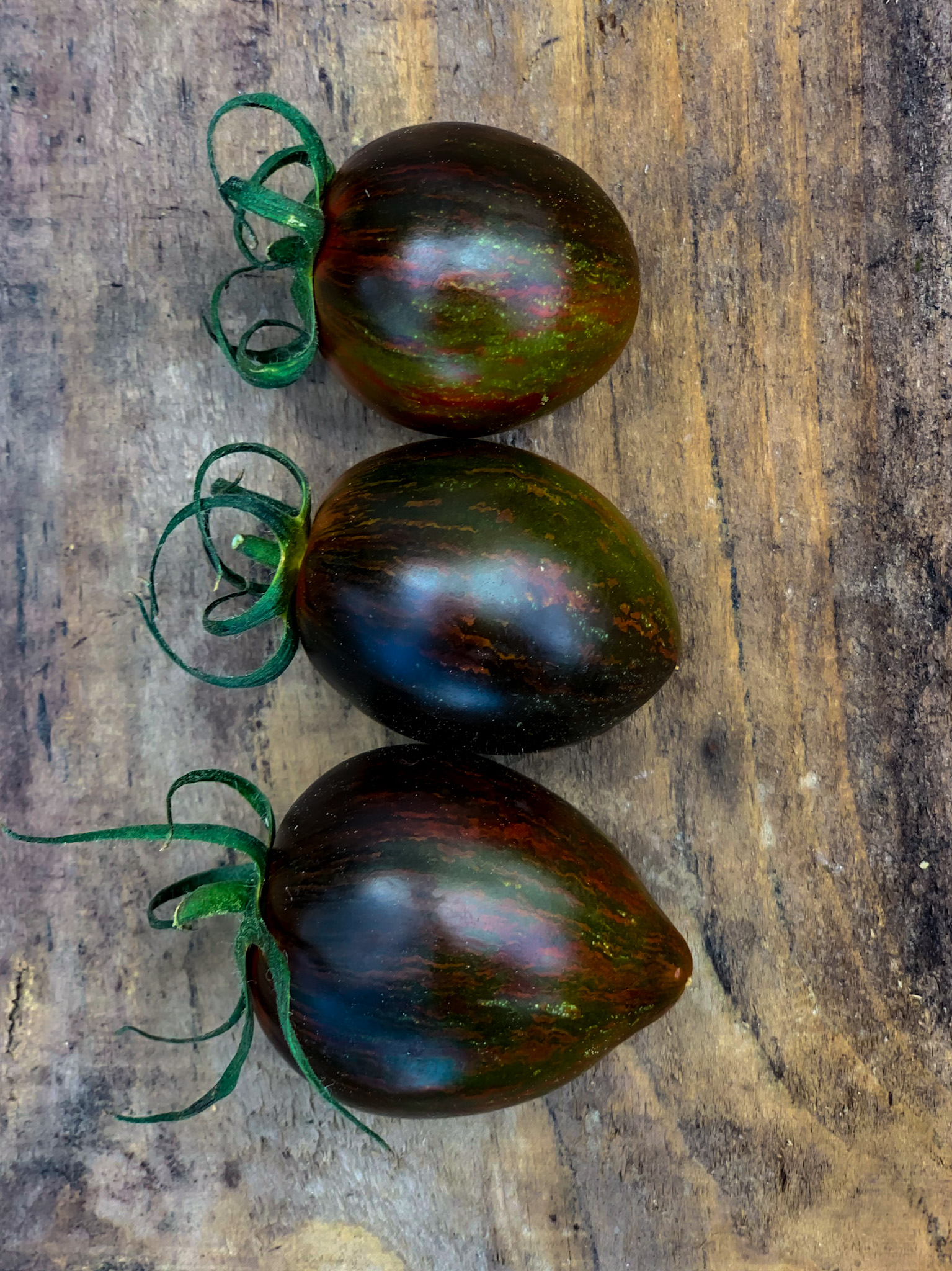 The viral social media sensation with a kaleidoscope of colours including purple, blue, black, gold, red, and green. The elongated shape looks like a giant grape. Not just a pretty face, it’s sweet, complex and smoky flavour makes it a delicious salad tomato.