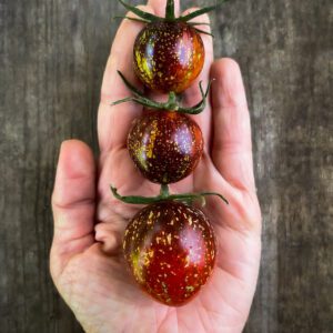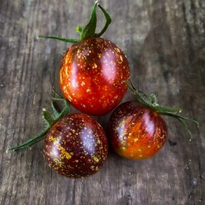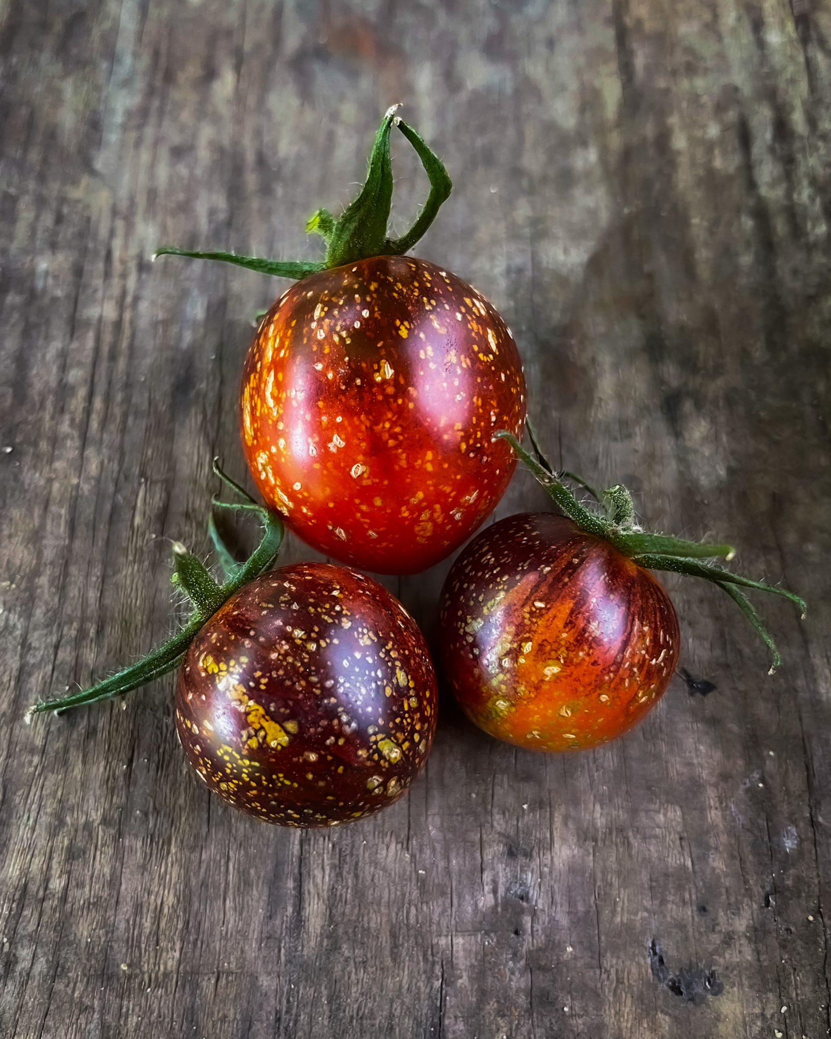 A unique, mottled tomato, that looks like a slice of outer space! Medium fruit with variable shape, most often round, has a delicious, balanced flavour. The green and purple skin becomes rusty red and black with golden speckles at full maturity.