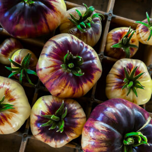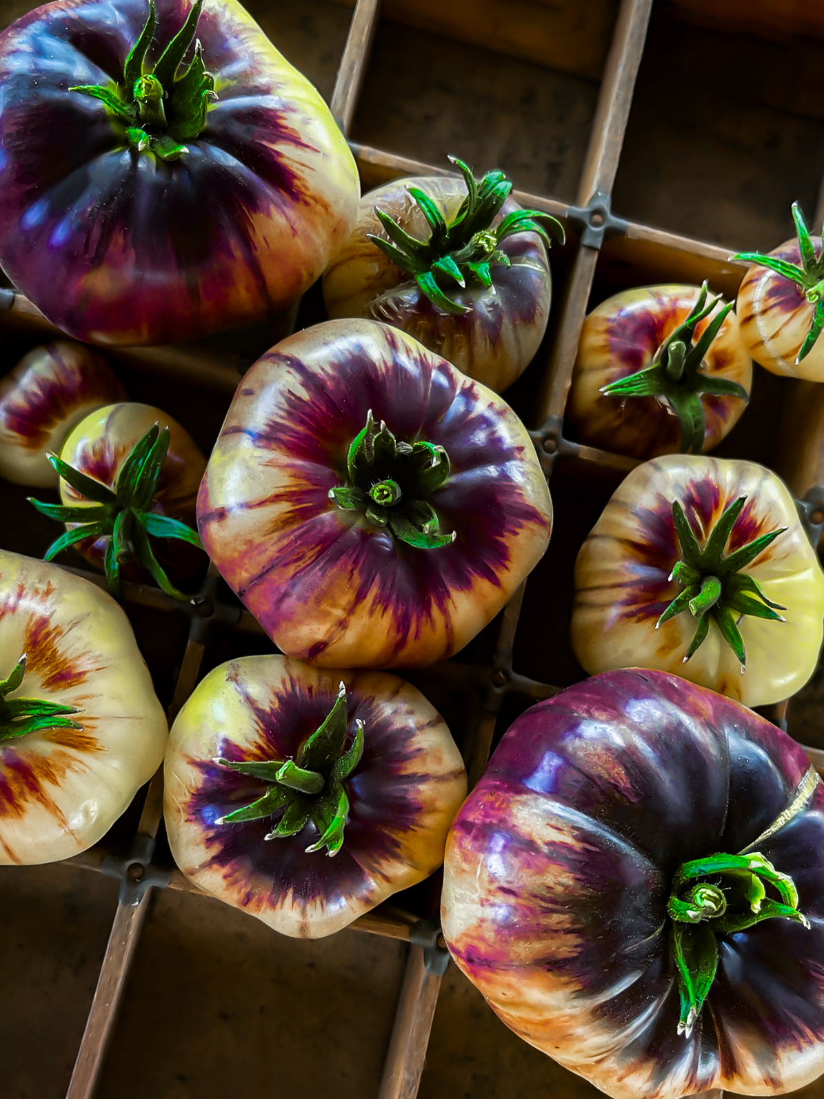 Tomato ‘Sart Roloise’ is a true looker, with its golden skin, painted at the top with purple brush strokes and juicy flesh that’s almost too pretty to eat. But eat it you should – the flavour is complex, rich, sweet, and fruity with a melt-in-the-mouth texture. A rare, luxurious beefsteak that turns heads and some say tastes just a little bit tropical.