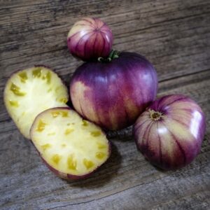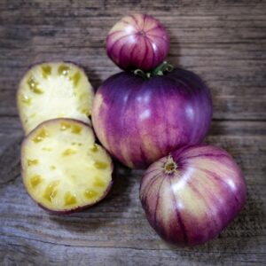 Tomato ‘Sart Roloise’ is a true looker, with its golden skin, painted at the top with purple brush strokes and juicy flesh that’s almost too pretty to eat. But eat it you should – the flavour is complex, rich, sweet, and fruity with a melt-in-the-mouth texture. A rare, luxurious beefsteak that turns heads and some say tastes just a little bit tropical.