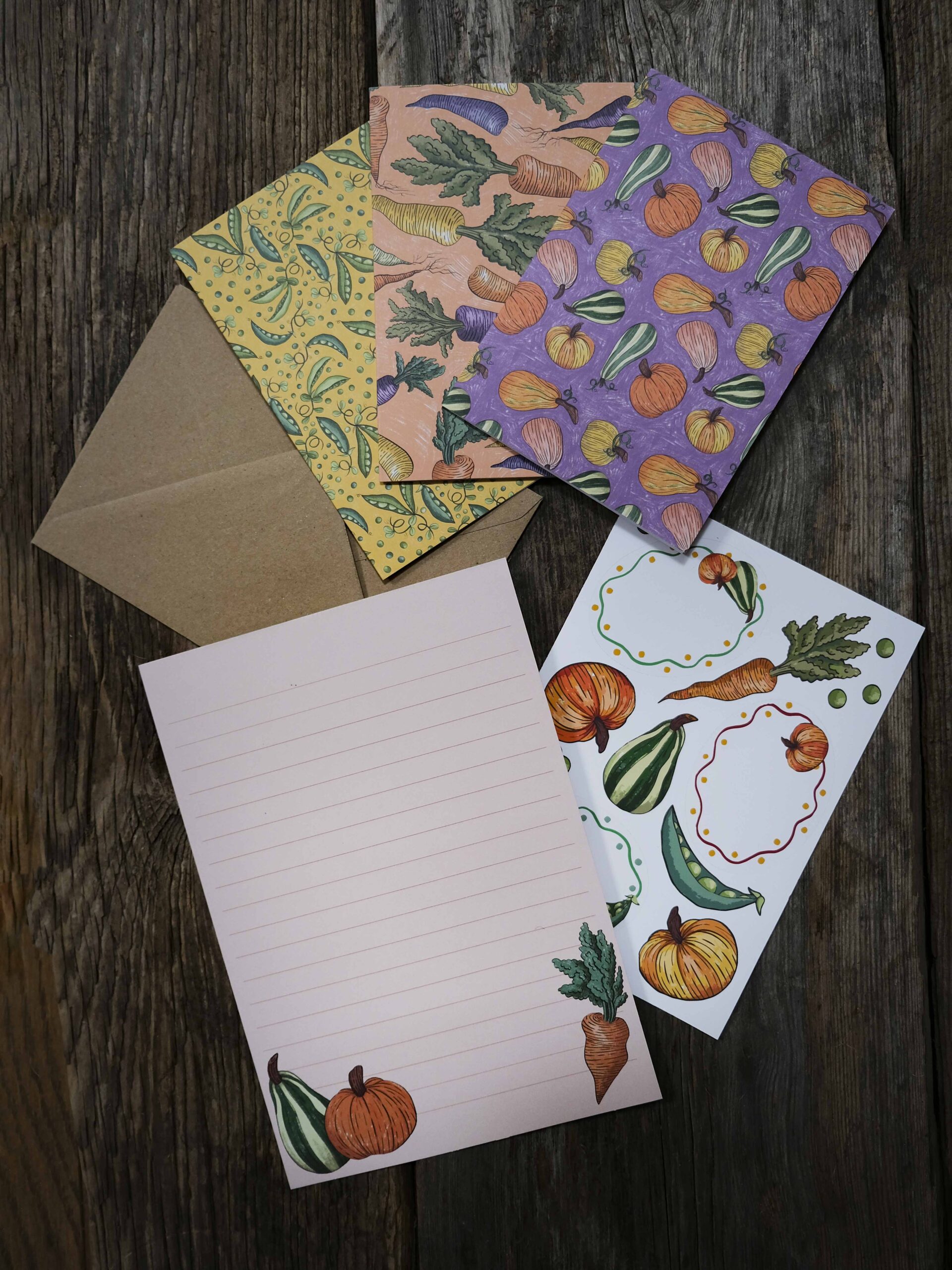 Each sheet is adorned with vibrant illustrations of your favourite vegetables, making every letter feel like it’s fresh from the garden. The set includes coordinating kraft A6 envelopes to match the earthy, veg-loving vibe.