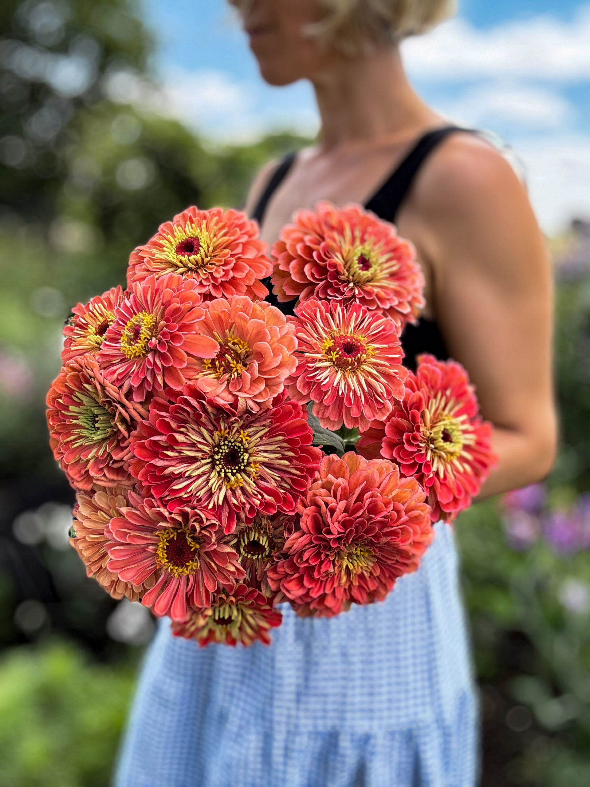 A spectacular zinnia with tall, strong stems topped with huge, fully double blooms in rich, romantic shades of coral-pink with a hint of rose. A cut flower favourite for its long vase life, it’s also loved by pollinators and brings a burst of colour that lasts well into Autumn.