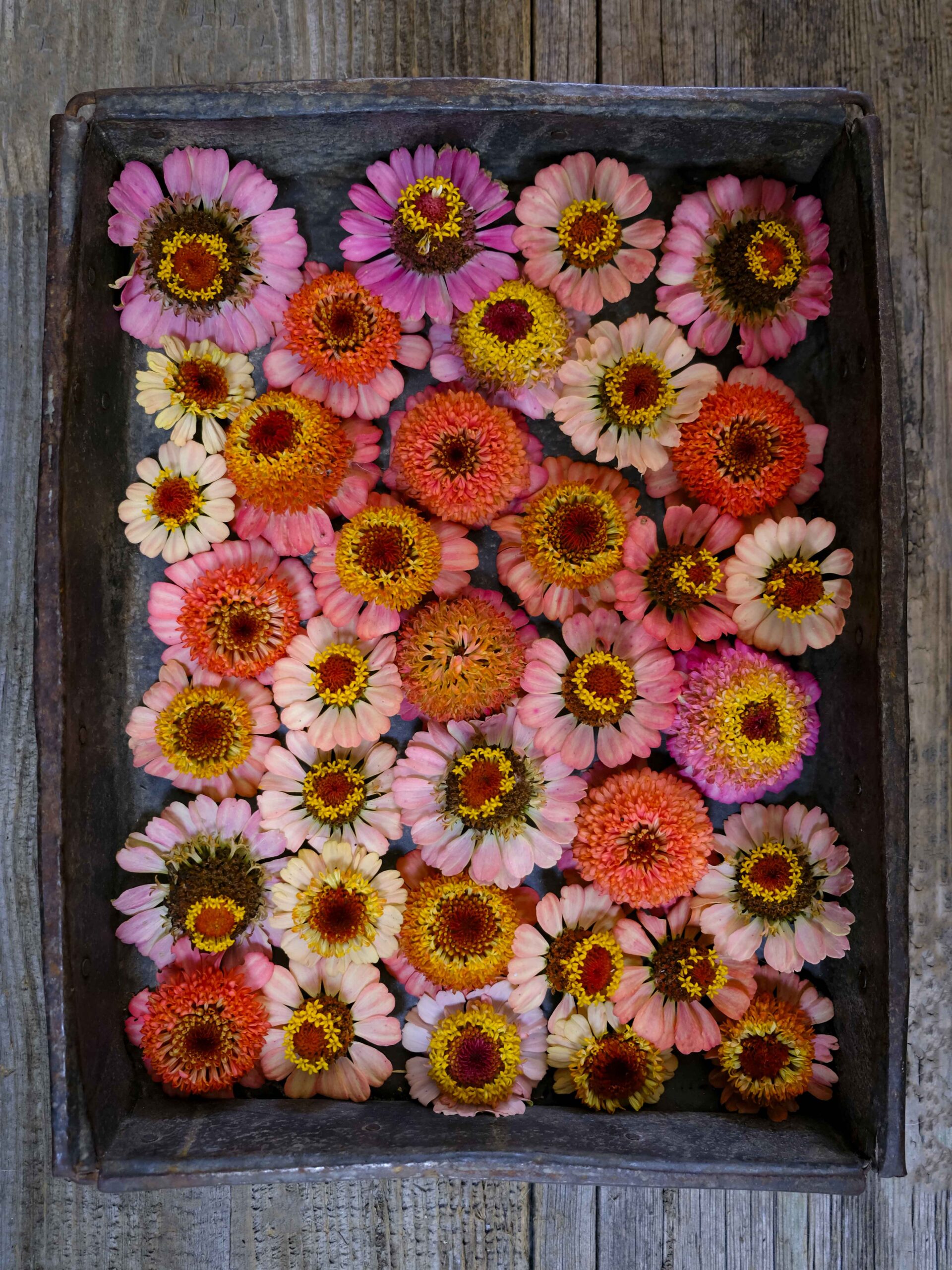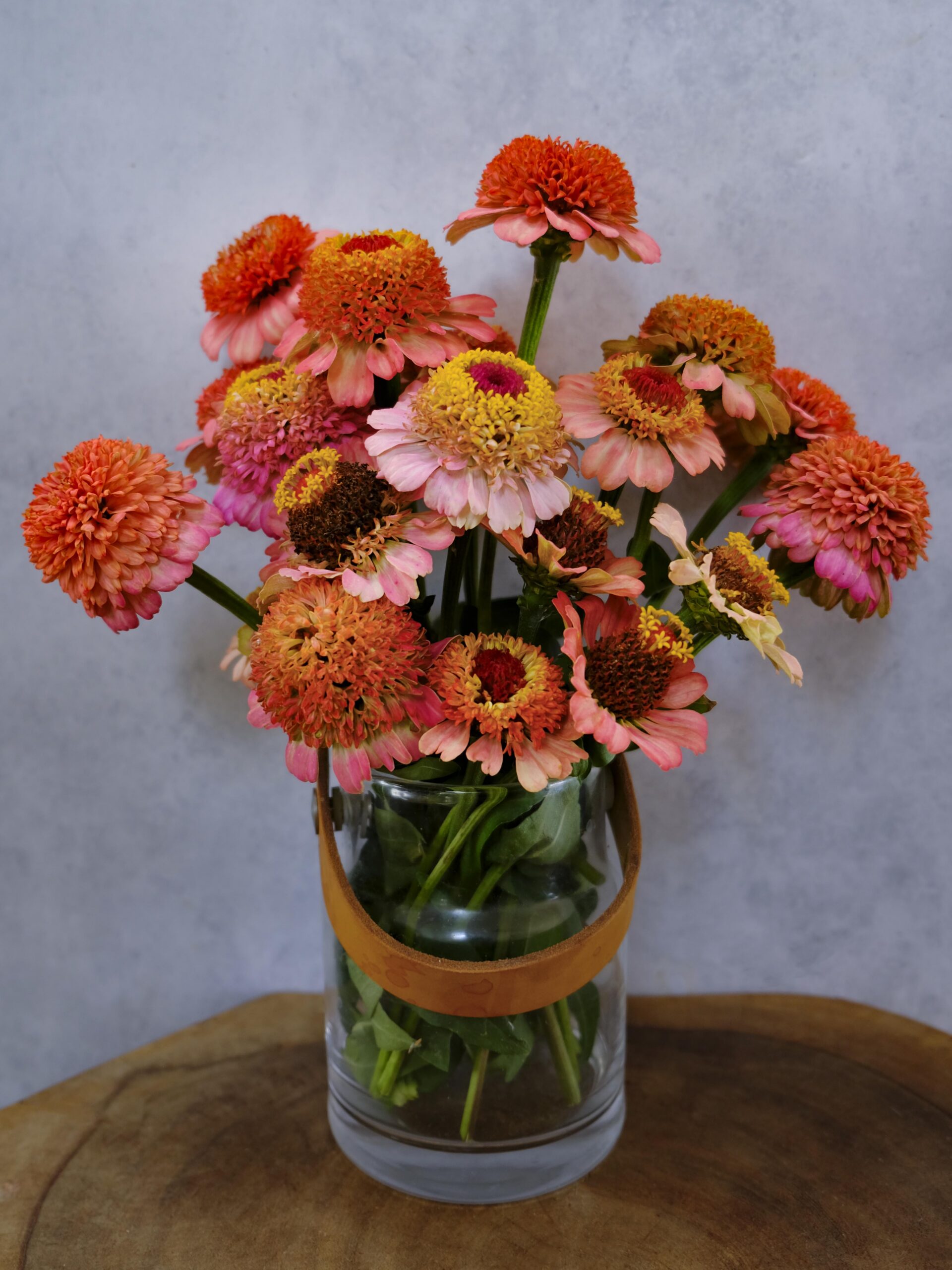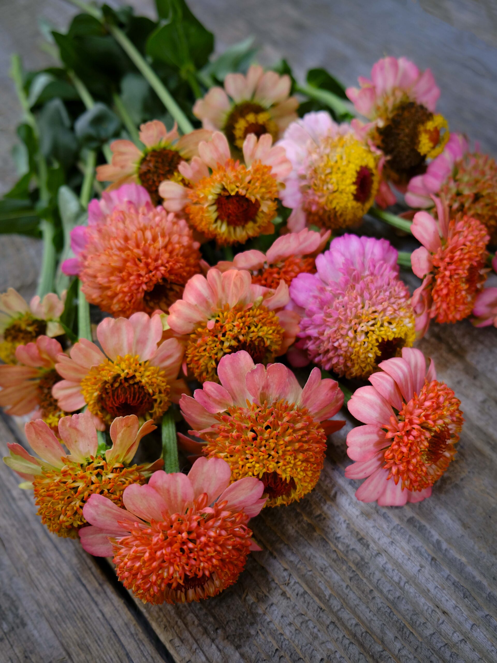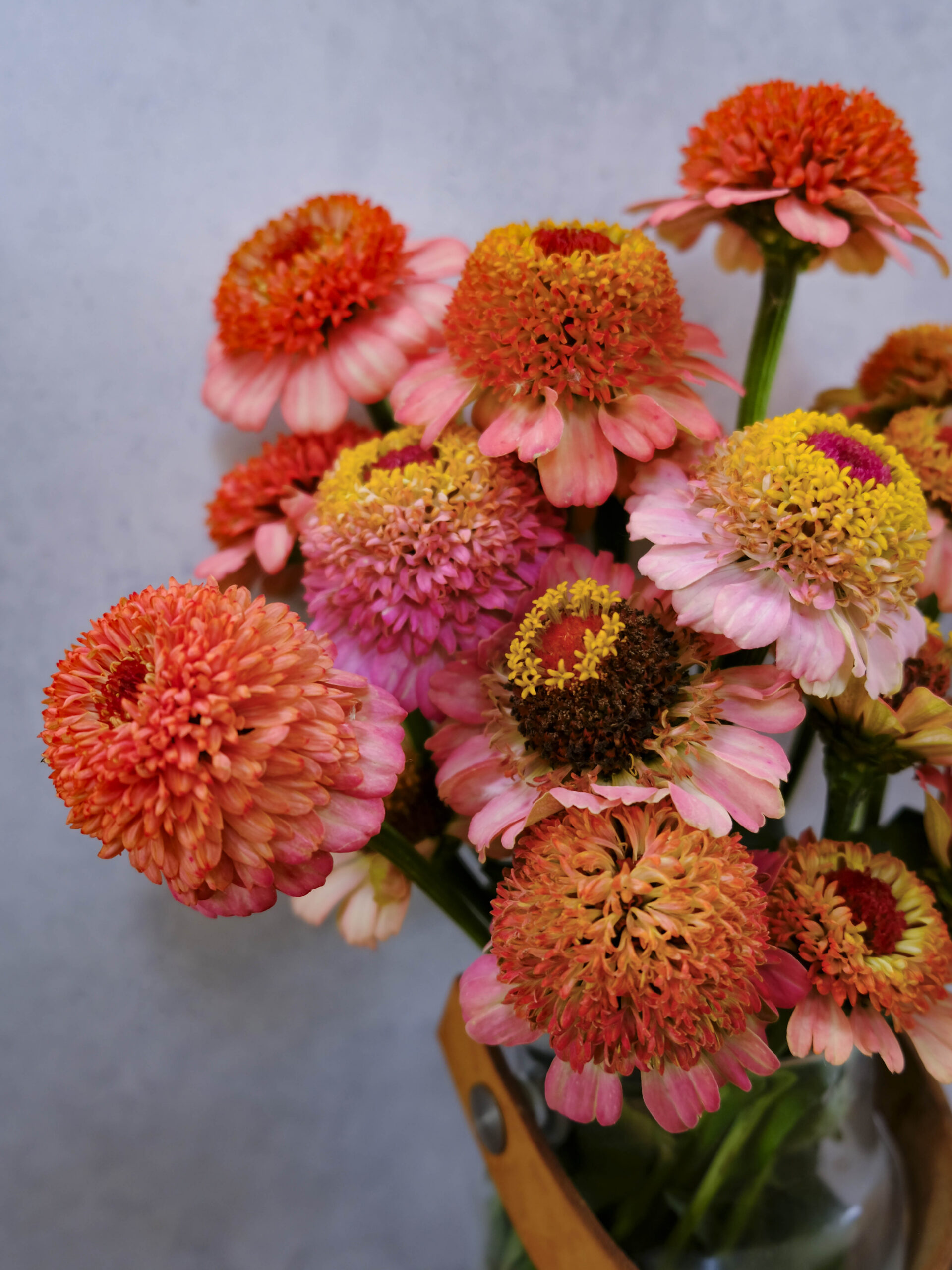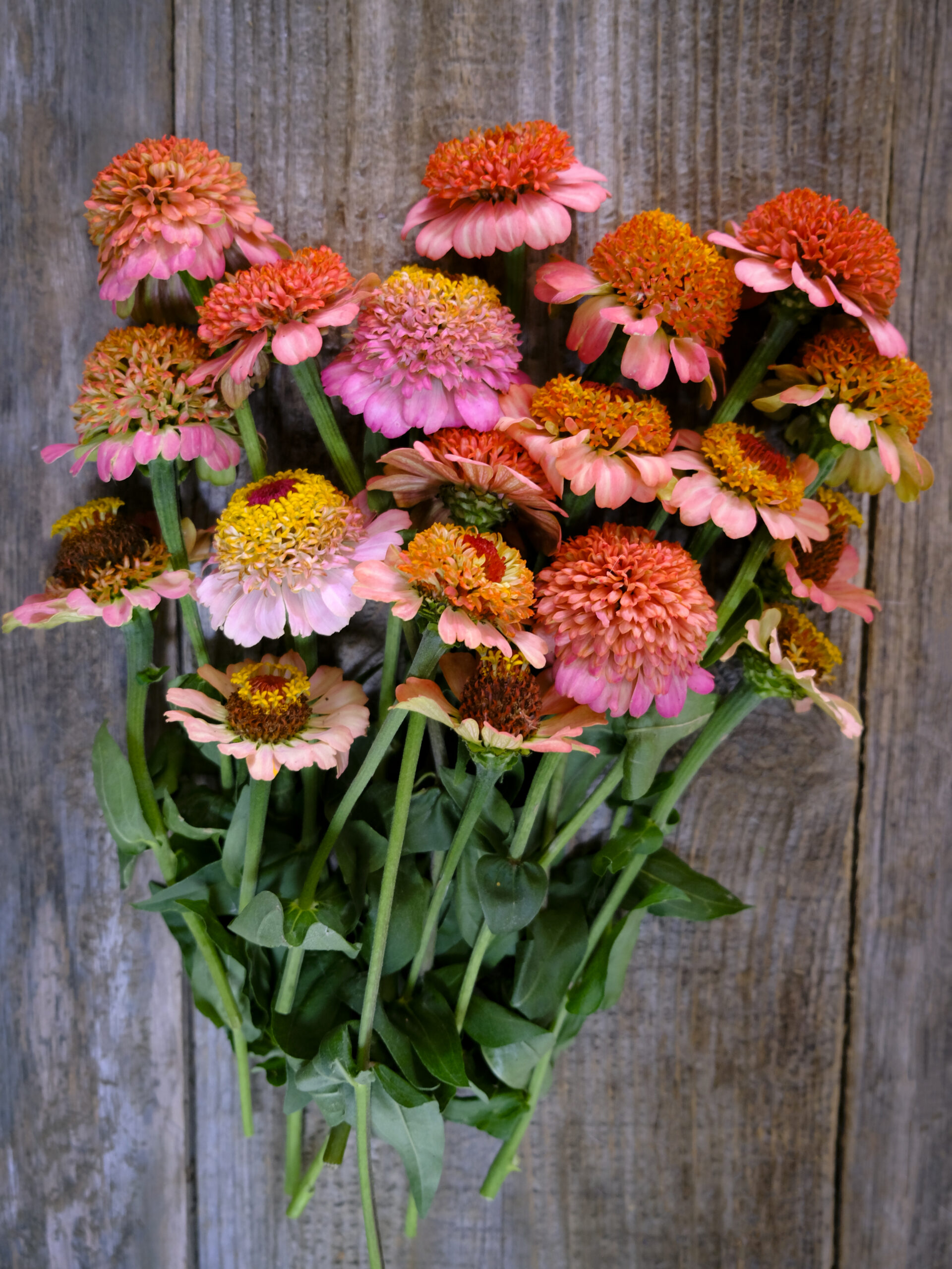 Frilly, double crested blooms in rich peach and coral tones with a hint of neon pink. These long-stemmed beauties are made for cutting, adding a vintage glow to borders, bouquets, and beds. Loved by pollinators and gardeners alike.
